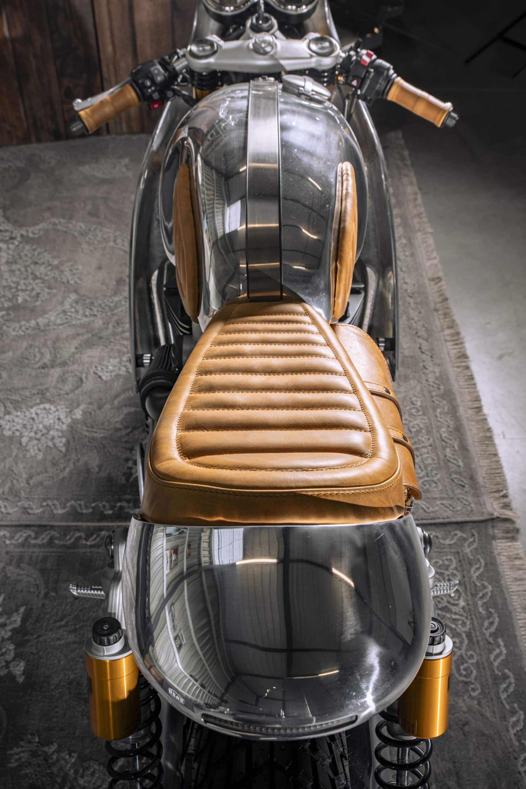 Un coup de foudre … un habillage signature 2020 Motorcycles sur la plus emblématique des Modern Classic Triumph, la Thruxton 1200 RS, cette fois ci nous voulons voir le moteur, nous souhaitons une sellerie et un travail sur le cuir de haute volée et un pur café racer anglais exploitable au quotidien, abracadabra voici notre 10ème réalisation, une merveille de finition.